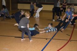 Von dieser Trainingsmethodik profitieren regelmäßig sowohl jüngere Teilnehmer, wie zum Beispiel die 5-jährige Martha Junk. Bei dieser Trainingseinheit, die von einigen Spielen unterbrochen wurde, lernten die Kinder auch Stabilisationsübungen zur Stärkung der Rumpfmuskulatur kennen. Auch Pratzentraining zur Verbesserung der Präzision und der Kraftabgabe der Technik wurde eingesetzt.
