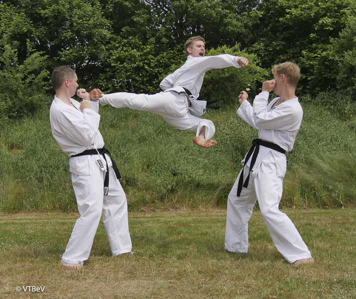 Für die höhergraduierten Teilnehmer wurden in dieser Trainingseinheit auch Techniken geübt, die im Vereinstraining eher selten ausgeführt werden. Unter anderem trainierte Alexander Schumann den Chirumyo Chagi, bei dem zwei Gegner bekämpft werden. Zum einen wird dabei ein Tymyo Yop Cha Chirugi und zum anderen ein Tymyo Chirugi ausgeführt.