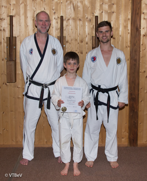 Hier wurde dem erfolgreichen Prüfling Jonah Alberts seine Urkunde für die bestandene Gürtelprüfung zum 9. Kup überreicht.